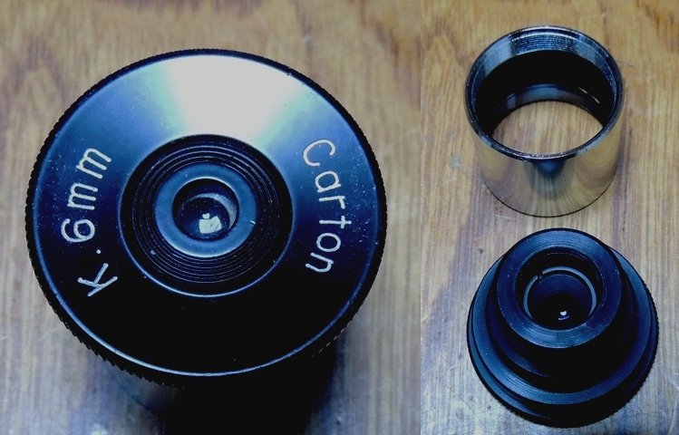 3枚目は数少ない国産のモノセントリック。レンズ形式はハスチングです。焦点距離50mmなので視野は激狭。ルーペの5倍の流用と見られます。これはスカイアンドテレスコープの古いものに広告が出ていますが国内販売は無かった模様。ビクセン古老も出所は覚えておられなかった逸品。
