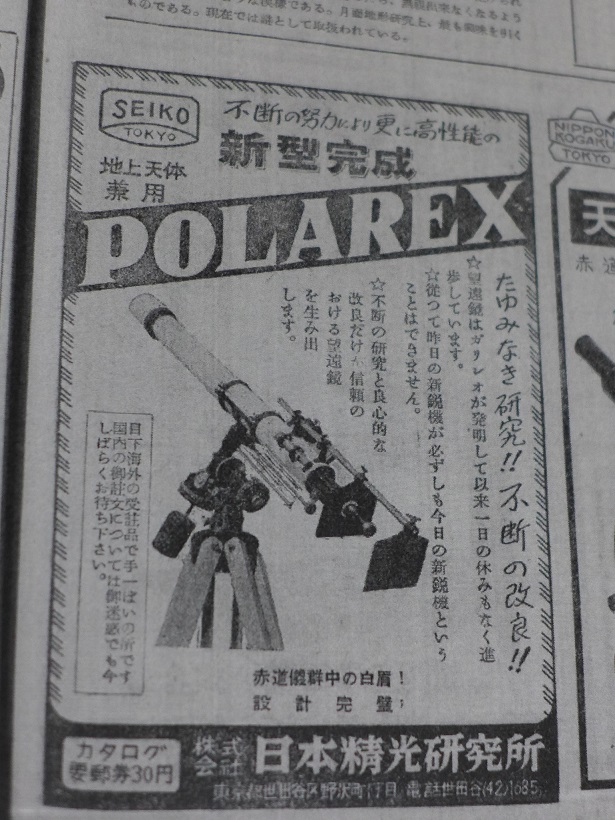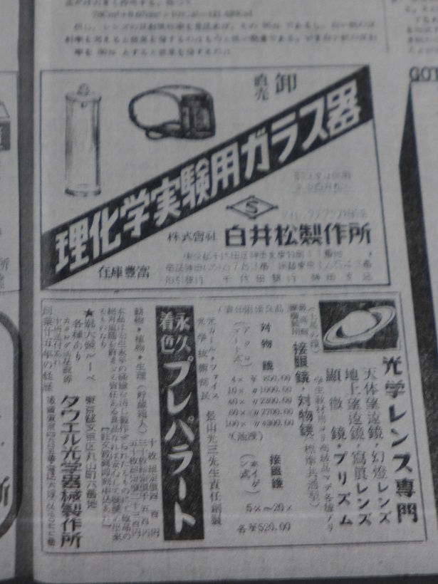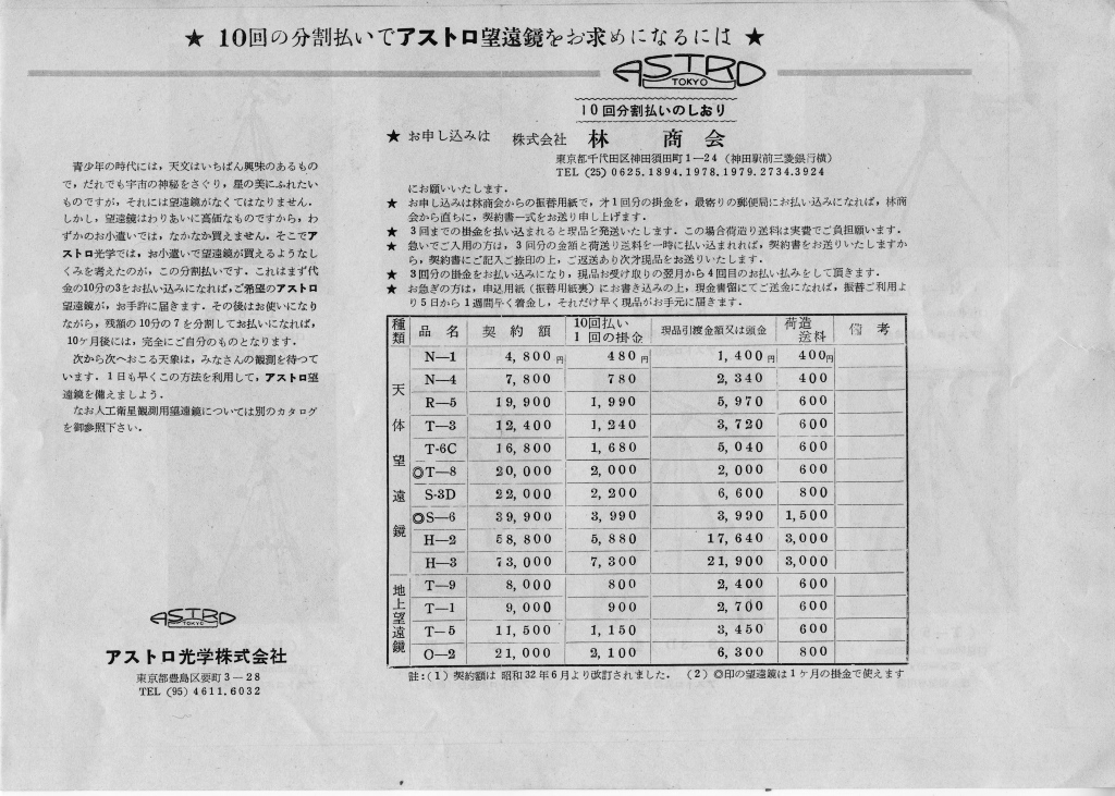 前スレで議論されたように、この時期はアマチュアや中学生がどんどん買ってくれる時代にはまだなっていなかったのは明白です。 理振法の施行がちょうど昭和29年4月ですので、アストロ光学にとってはビッグチャンスだったはずですが、需要発生に間に合わなかったのかもしれません。