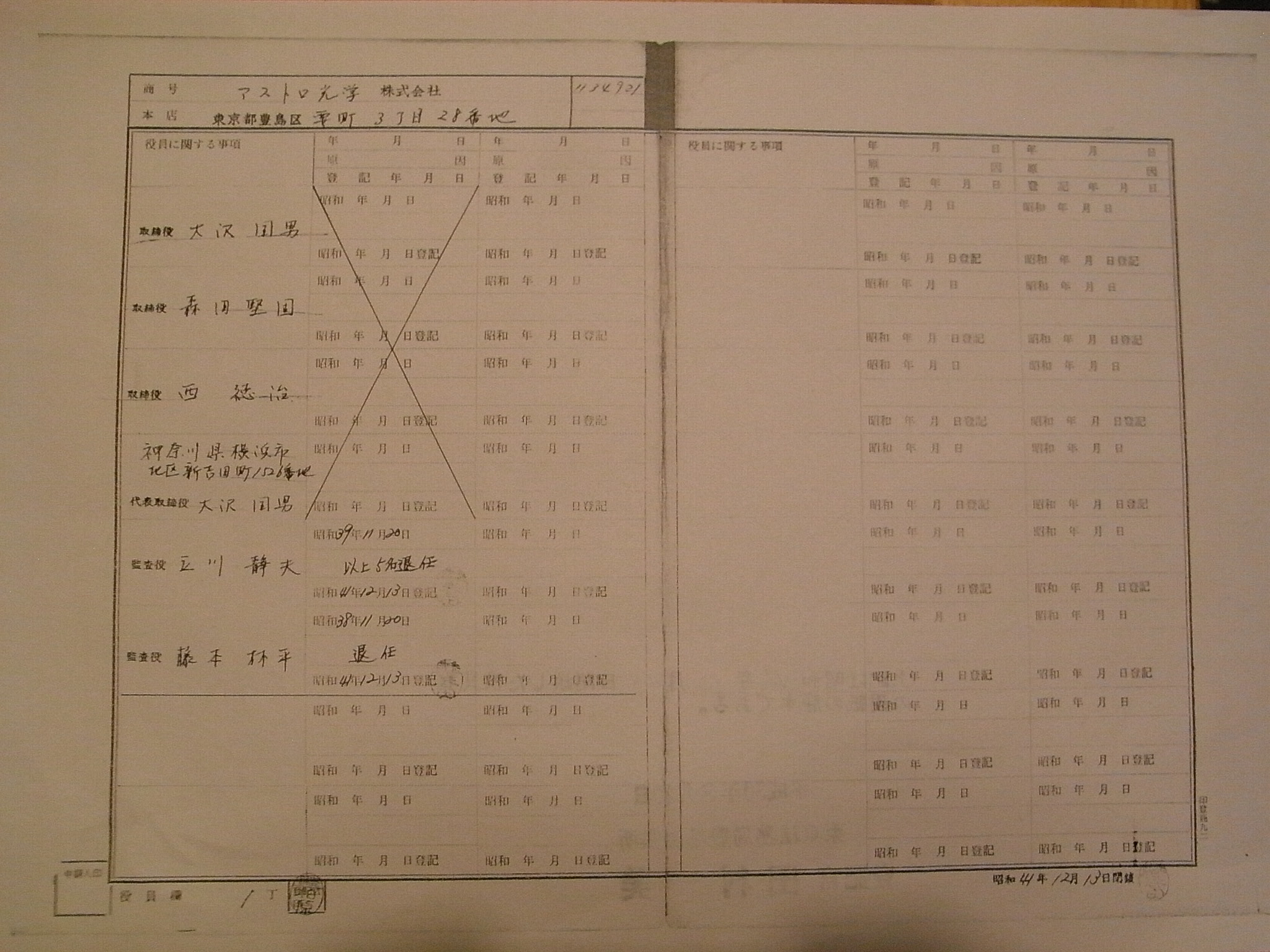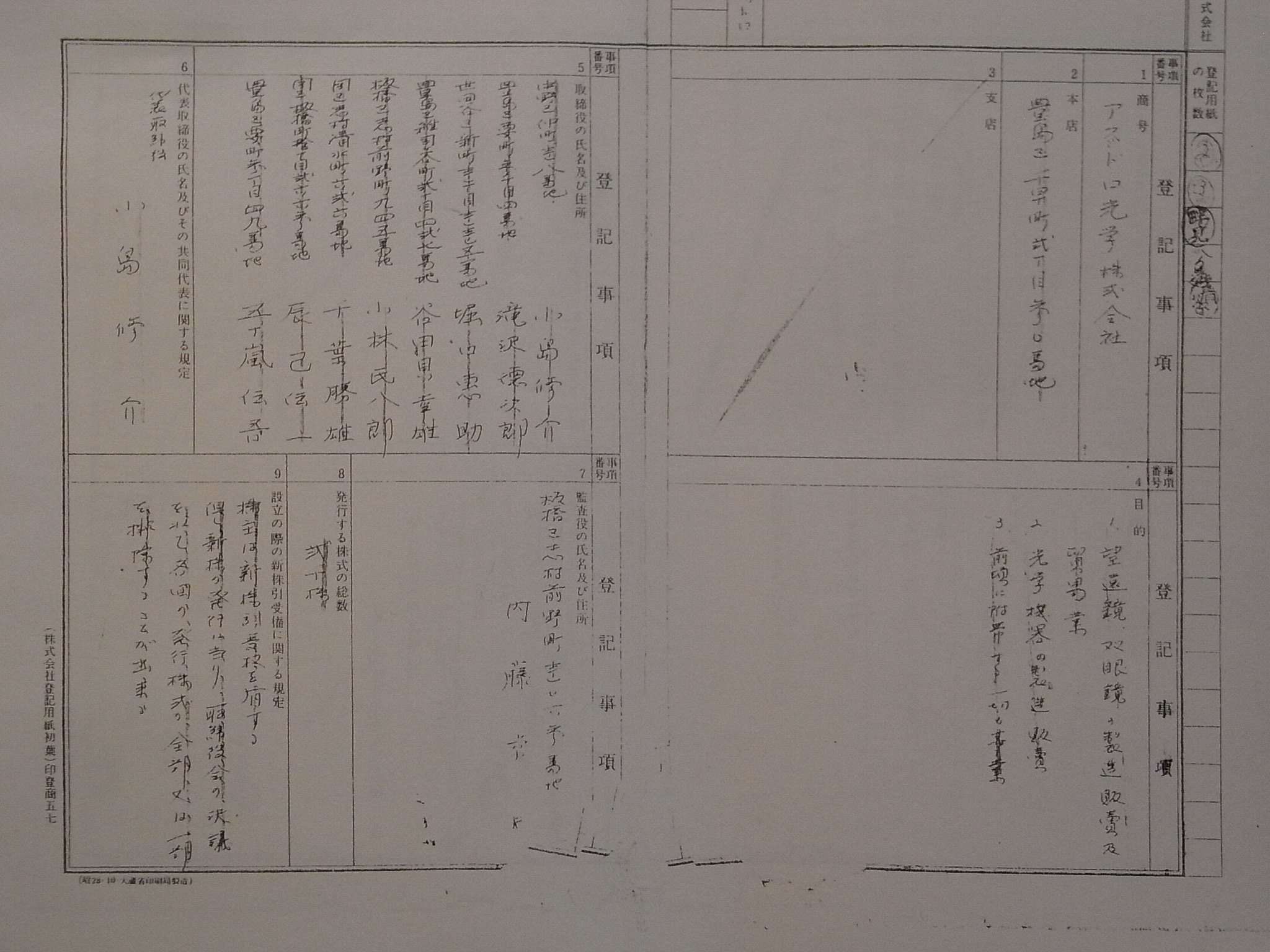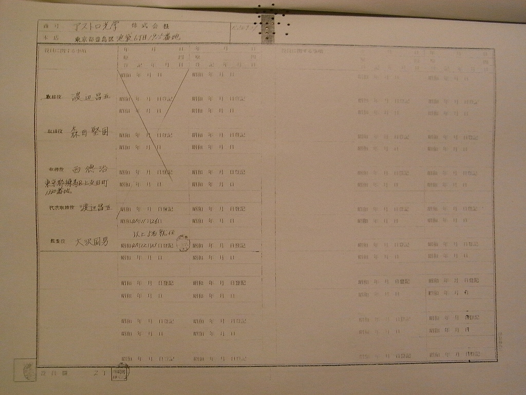 1951年(S26年) 五藤光学退職。アストロサービスセンター設立(個人会社) 1952年(S27年) 旭光学工業株式会社 入社(←未確忍?) 1954年(S29年)11月 アストロ光学株式会社 設立 代表 小島修介氏 (他 取締役7名) 豊島区千早町2丁目30番地 資本金50万円 2千株 1955年(S30年) 3月 新株発行により4千株へ増資 1956年(S31年) 2月 豊島区要町3丁目30番地へ移転 取締役2名退任 監査役 浅原栄二郎氏就任 1957年(S32年) 5月 豊島区要町3丁目28番地へ移転 1957年(S32年)11月 代表小島氏、代表浅原氏、取締役小林氏、滝沢氏、内藤氏、左記全員辞任 小澤三男氏 取締役就任 1958年(S33年) 2月 豊島区西巣鴨2丁目へ移転 “アストロ光学工業株式会社”設立 会長小澤三男氏(要町3丁目28番地) 1959年(S34年)11月 アストロ光学解散(解散登記)但し“存続ス”との登記記録 1960年(S35年)*月 小島氏他界 1961年(S36年) 6月 豊島区要町3丁目28番地へ移転(戻り) 同年 9月 清算人が浅原氏から藤本林平氏へ交代 1962年(S37年)11月 大沢国男氏 代表 取締役 藤田堅固氏 西徳治氏 「雑貨品の輸出入貿易業」を営業目的に加えて再開 屋号は“アストロ光学”だが名称は“アストロサービスセンター” 1966年(S41年)11月 豊島区池袋6丁目1915番地へ移転 1971年(S46年)11月 渡辺昌五氏 代表就任 1974年(S49年)12月 解散(アストロ光学工業へ吸収併合)