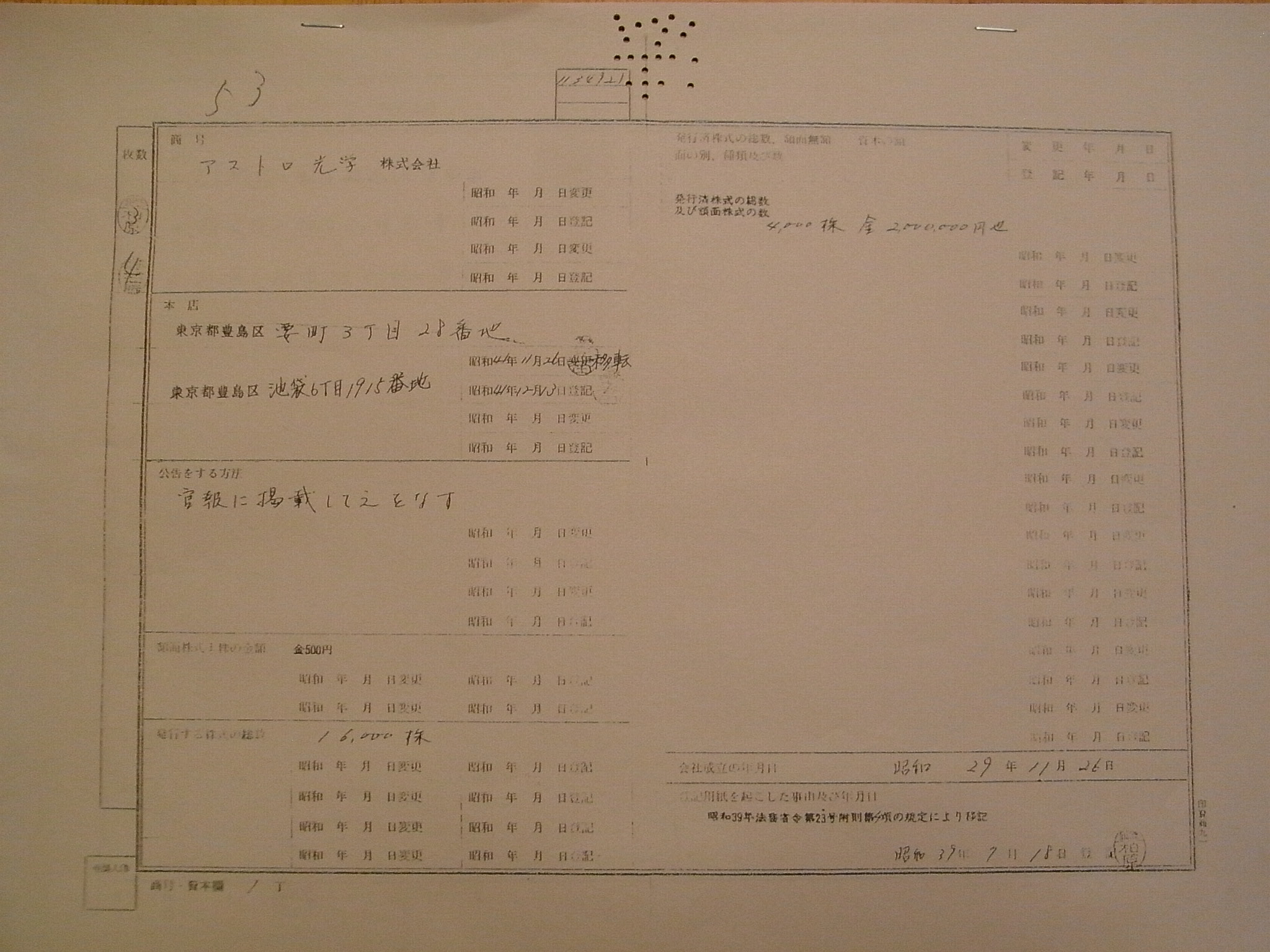 アストロ光学の不動産登記簿もみたいですねぇ。 要町の工場の所有権が、どうなっているのか。 アストロ光学工業への委譲の経緯もわかるかもしれません。 |