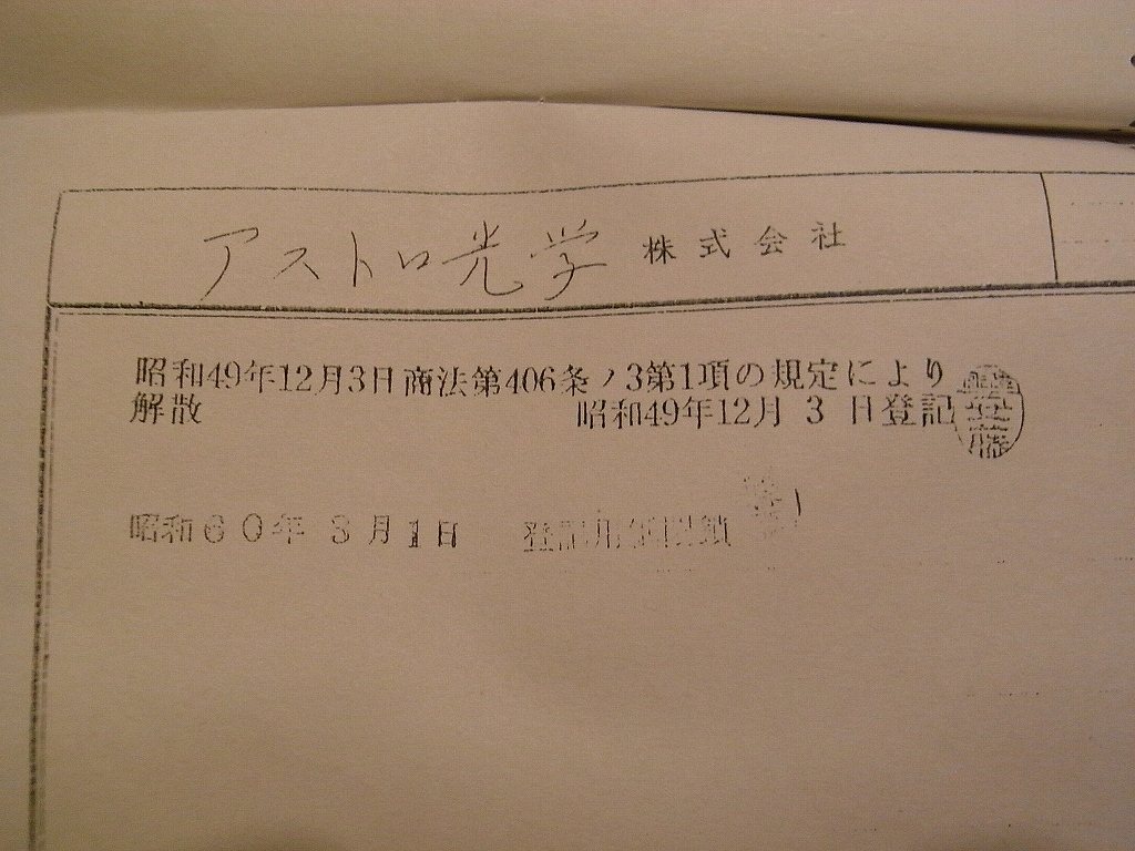 ※渡辺昌五氏ですが、アストロ光学工業(株)取締役会長なんですが、 この方が、1971年にアストロ光学(株)の代表取締役に就いています。 このことからも、アストロ光学工業(株)と関係が強くあったと考えられます。