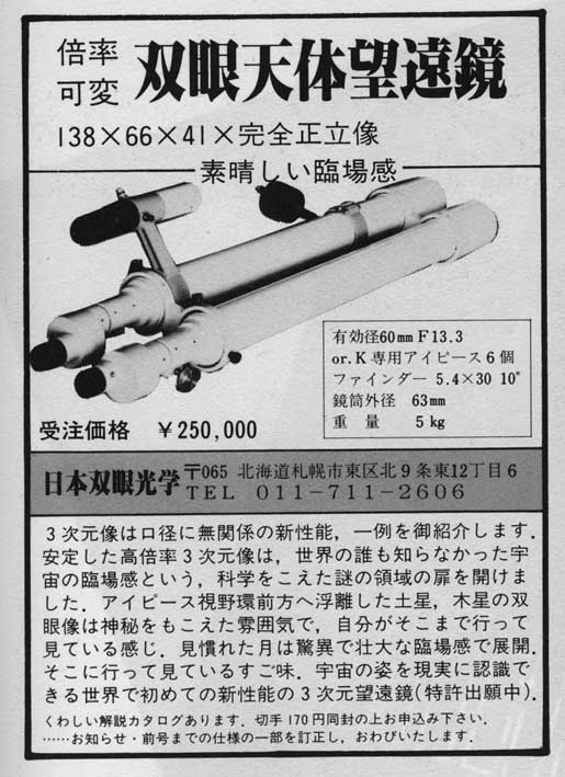 天文ガイド1984年8月号の広告です。北海道札幌市にあったという日本双眼光学ですが