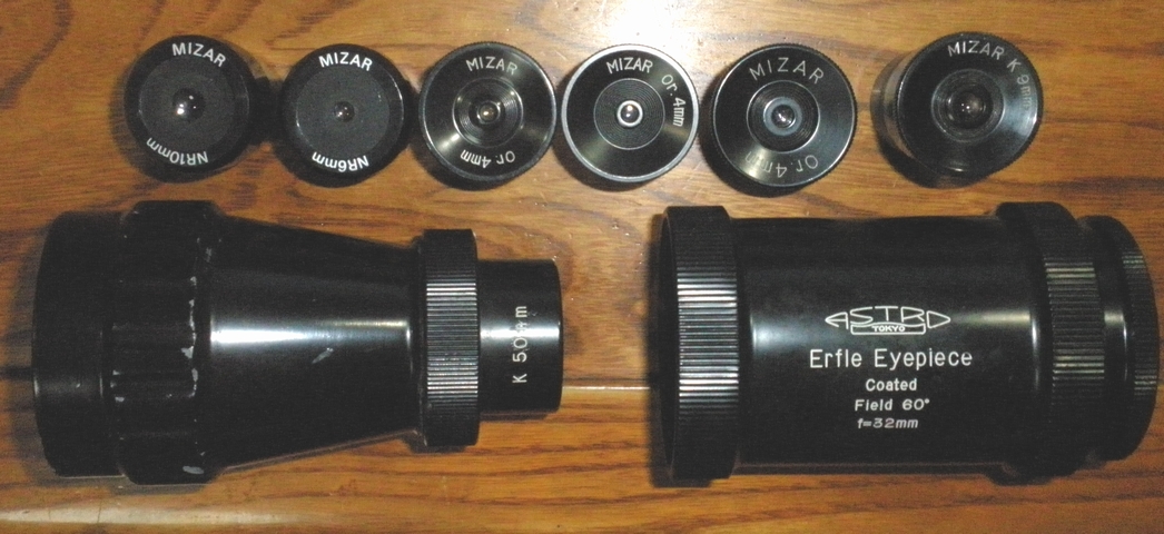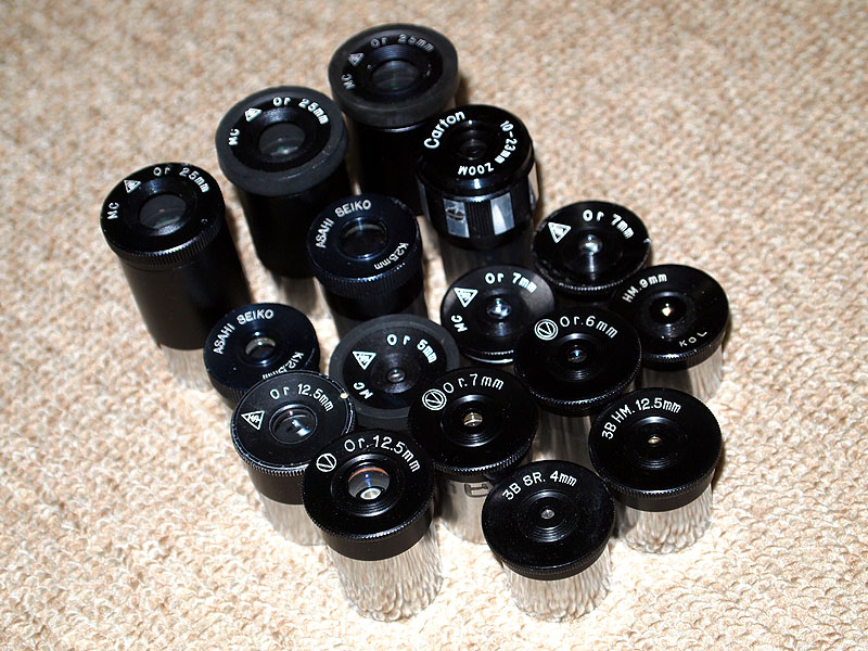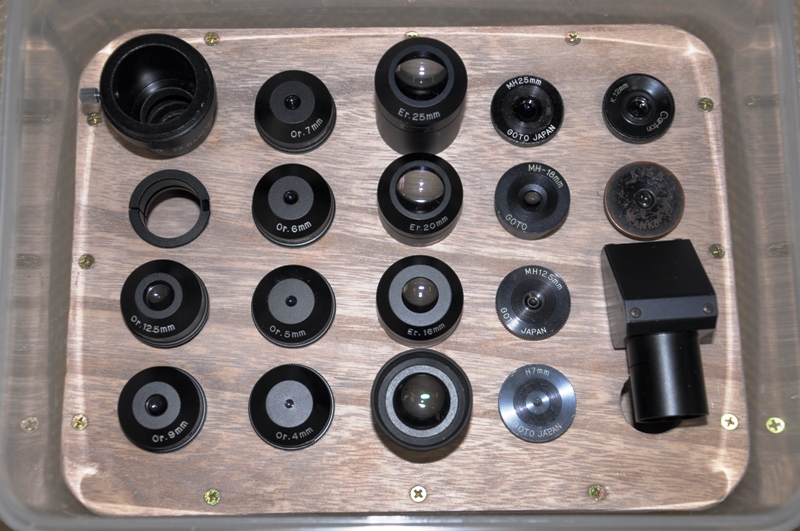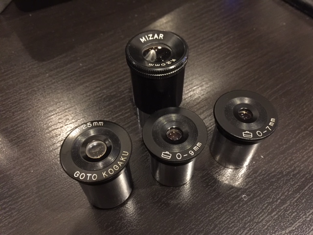 それから右から2列目のGOTOの一団の一番下のH7mmは中学生の時に友人から借りた物を返し忘れ同窓会で 返却を申し出たら不要とのことで譲って頂いた物です。 GOTOのMHシリーズは15cm/F15アクロマート鏡筒の相方として色収差を補完してくれるのでオークション等で数年前に集めました。 モノコートですが抜けの良い像を見せてくれます。