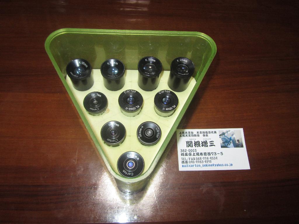 タキさん、ひぽぽたますさん、みなさん、こんばんは。 24.5Φアイピース100本以上あるはず? Cartonのアイピース2本づつ呑さんの名刺と一緒に。 あと、谷オルソじゃなくて谷ケルナー2本づつ