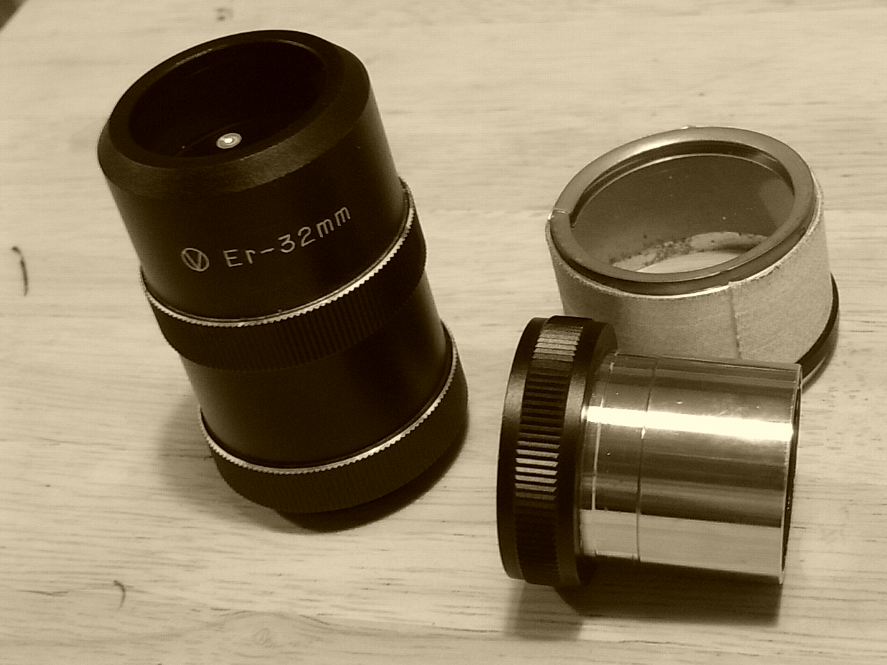 皆さまこんばんは。 古アイピースの話題も尽きそうにないですが、私は写真のようなビクセンのEr32mmをいまだに愛用しています。見え味、広視界、大きさ(重量)、中古価格のバランスが良いので、今でも星雲星団を探す時はこれが一番と愛用しています。写真手前側は36.4ネジ→φ31.7アダプターですが、いまだに新品で販売されているのが不思議なアダプターです。その奥の短筒状のものは使い古したメガネレンズをメガネ屋さんで丸く削ってもらって筒にはめ込んだもので、これをエルフレの上から差し込むとメガネをせずに乱視が矯正できます。(低倍率では瞳径が大きいので、、、) 36.4ネジのアイピースは2インチほど大げさではなく、個人的に好きなのですが絶滅したのが残念です。