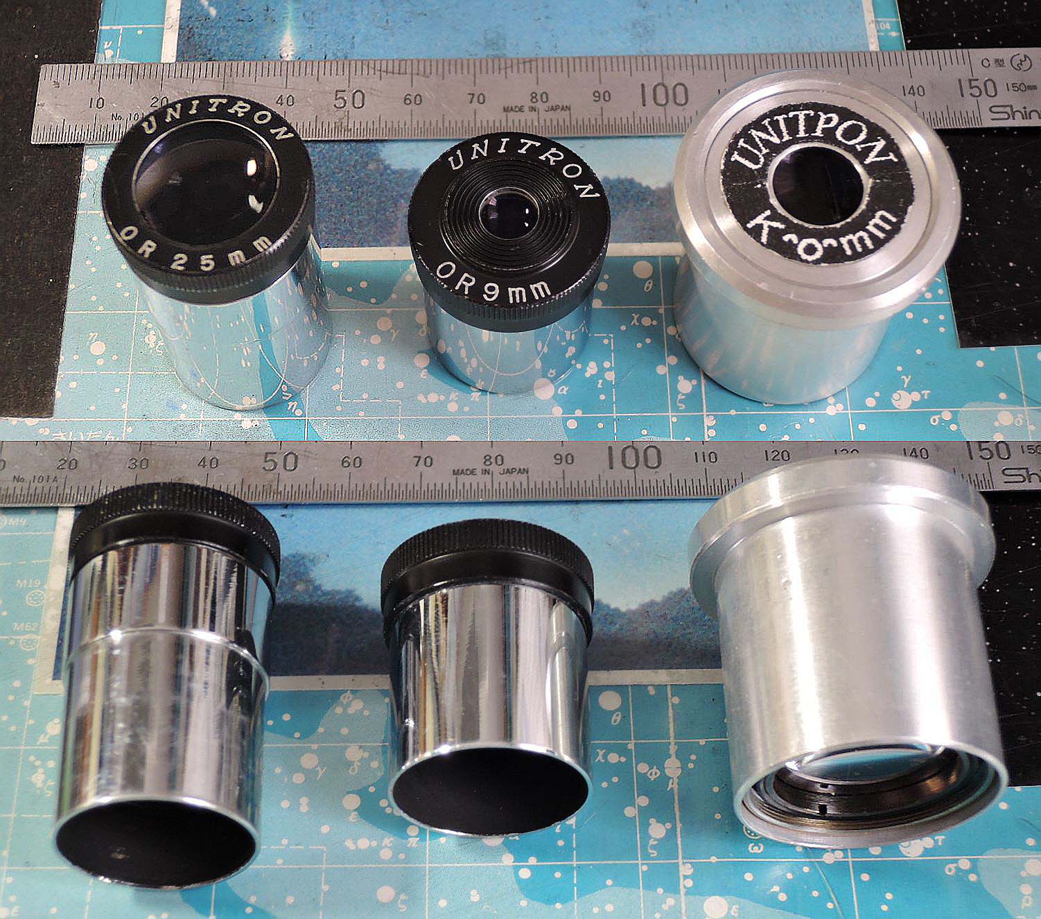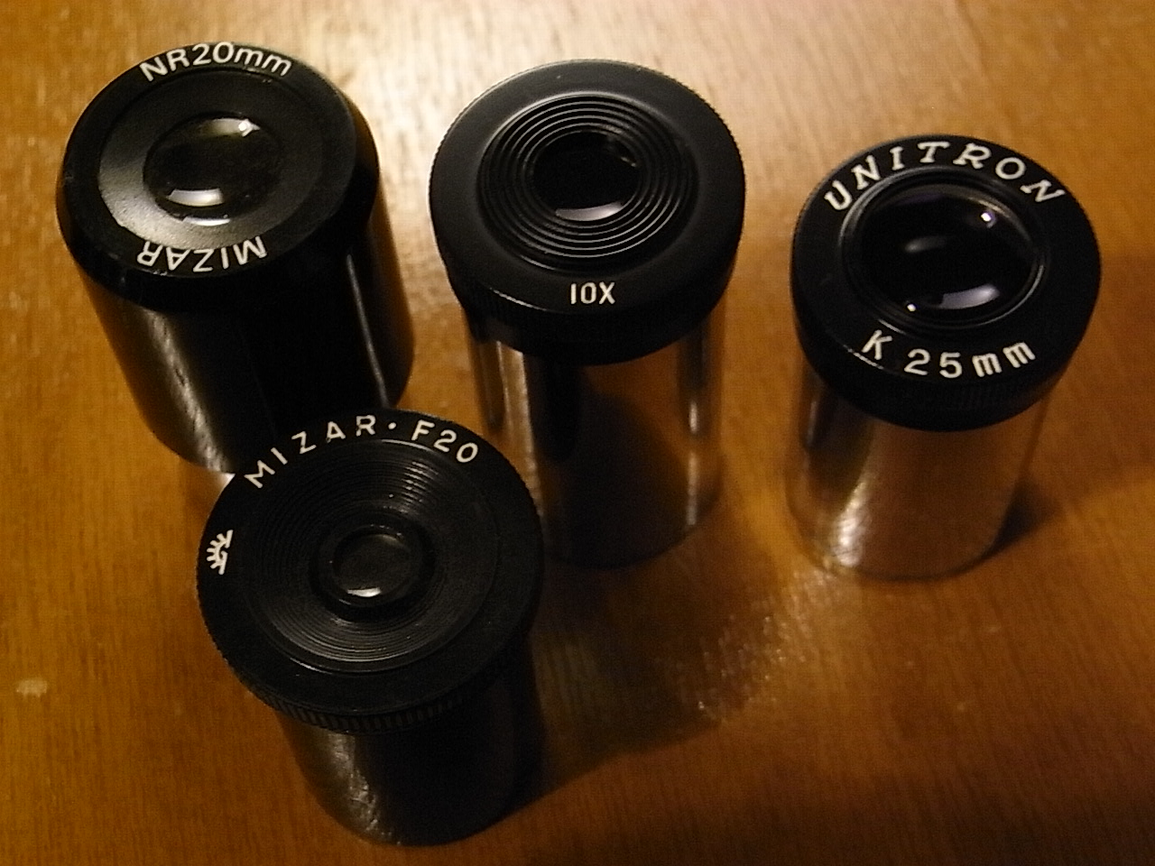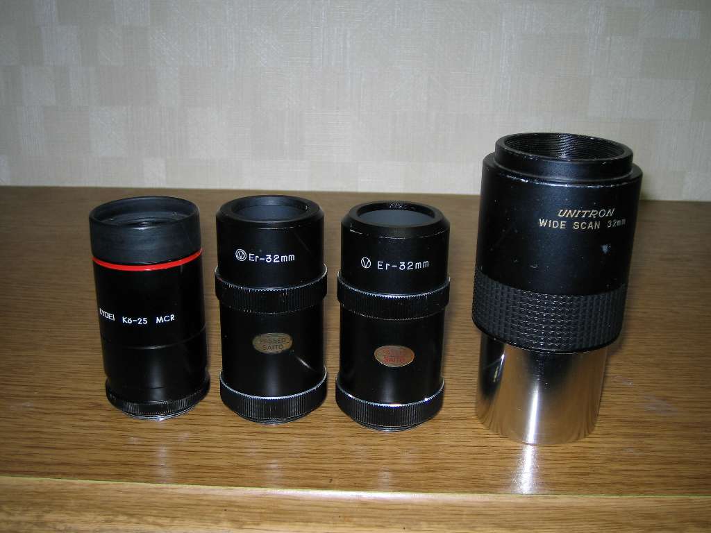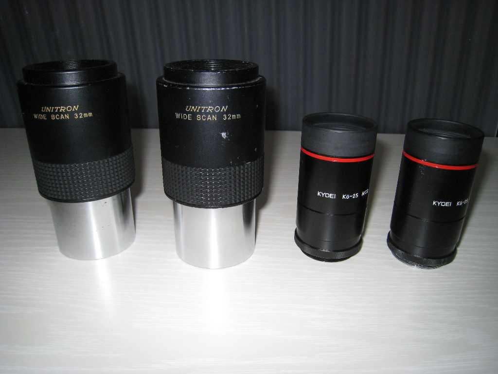 。。では調子に乗って、いんやリクエストに応えてユニトロンのお披露目と行きます。(^0^8 手持ちが少なくなってしまいましたが、どうも貴重品のようで、改めて感激です。 右端のは半自作のまがい物で、UNITPONと言い、φ30mm顕微鏡接眼Lの応用です。K20mmらしい。。