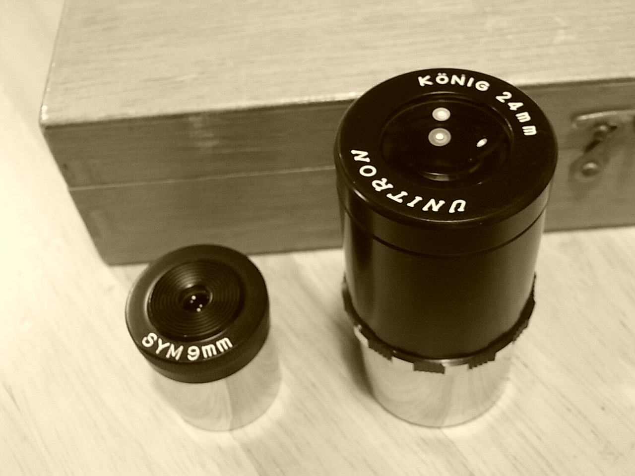 AH40やK25は今でもスコープタウンで非常にお手頃な値段と当時のままのデザインで販売されています。 '70年代を追体験することができます。。。 SYMやケーニッヒに興味がおありの方がいらしたので、私感を簡単に。 ユニトロンのSYM9はとてもレンズ径が小さく、見掛視界も30度くらいしか無いくせにアイレリーフがとても短いため、視野全部を見渡すことができません。 (現在の中華PL10のほうが数段良いです) アメリカンサイズのケーニッヒを偶然入手したのですが、視界はまずまず広いほかは どうも星像がピリッとしないし、アイレリーフも5mmくらいしかありません。 これも中華のPL25に総合的点で敵いませんが、”物珍しさ””話題づくり”で持ち歩いています。 レンズはともかく全体的な仕上げはとてもイイ仕事していて、私にとっては”覗かない”お宝です。