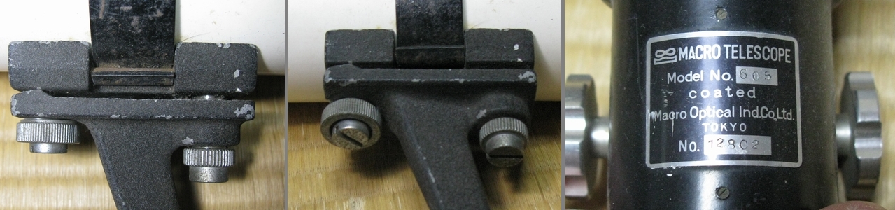 私の手元にMacro Telescope(Macro optical Inc)というメーカーのエイコーと出所同一らしき60mm鏡筒がありますが、これのファインダー調整部はガラクマさんのSWIFTの話に出てきた機種と構造が同じです。画面左側の親子ネジが偏芯ネジでローレット付きの方を回すと左右に振れる。画面右側のネジは普通の親子ネジで上下方向に振れるという構造。