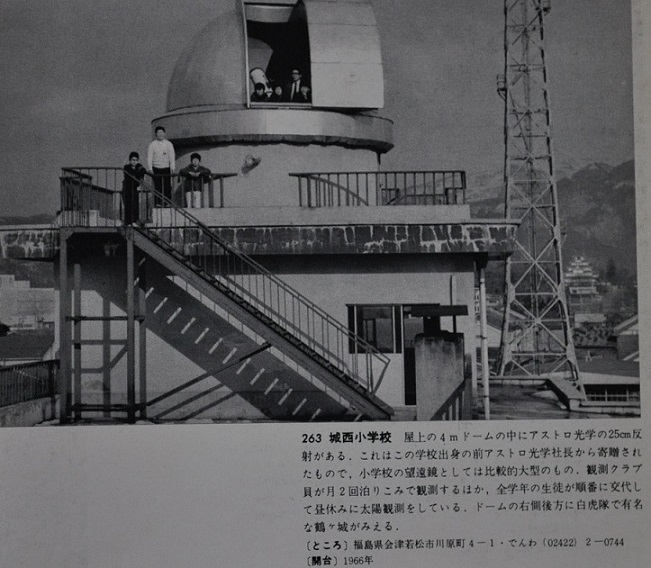 atoyanさん これですね→日本の天文台p127城西小学校(S47誠文堂新光社)。 まだあるようですが、 http://www.aizuwakamatsu.gr.fks.ed.jp/index.php?key=jo0o8qiui-311 を見ると、ドームの仕上げ表面や望遠鏡自体は、変わっているようです。