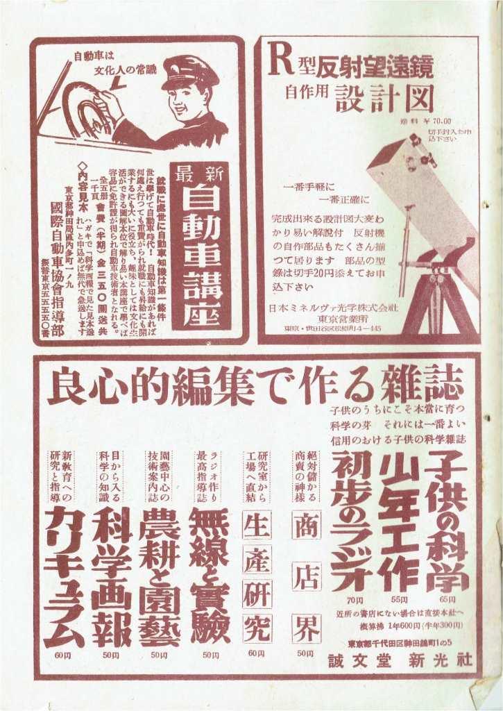 自作部品の広告自体は昭和3−4年頃からあったのですが、戦争近づくと(完成品の広告はあっても)無くなり、15?〜22年頃には望遠鏡自体の広告がないし、23年頃からまた自作部品の広告が現れました。