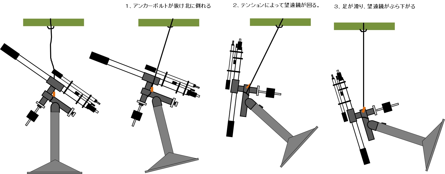 2.天井が引いてアンカーを抜いて、望遠鏡を振り回すことになるかも。