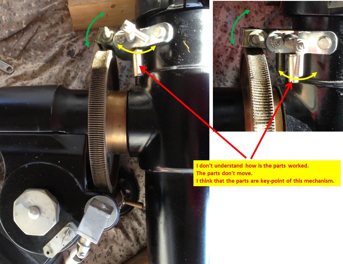 右の写真では赤緯クランプ軸、赤経クランプ軸ともジョイント部で曲がっていますが、本当は接眼部近くの軸受けに固定されているずですね(赤緯微動のシャフトも)。確かに赤経クランプノブは赤緯軸の回転につれて回転したと思います。しかし、使いにくいということはなかったですね。クランプのタッチも問題なかったですよ。
