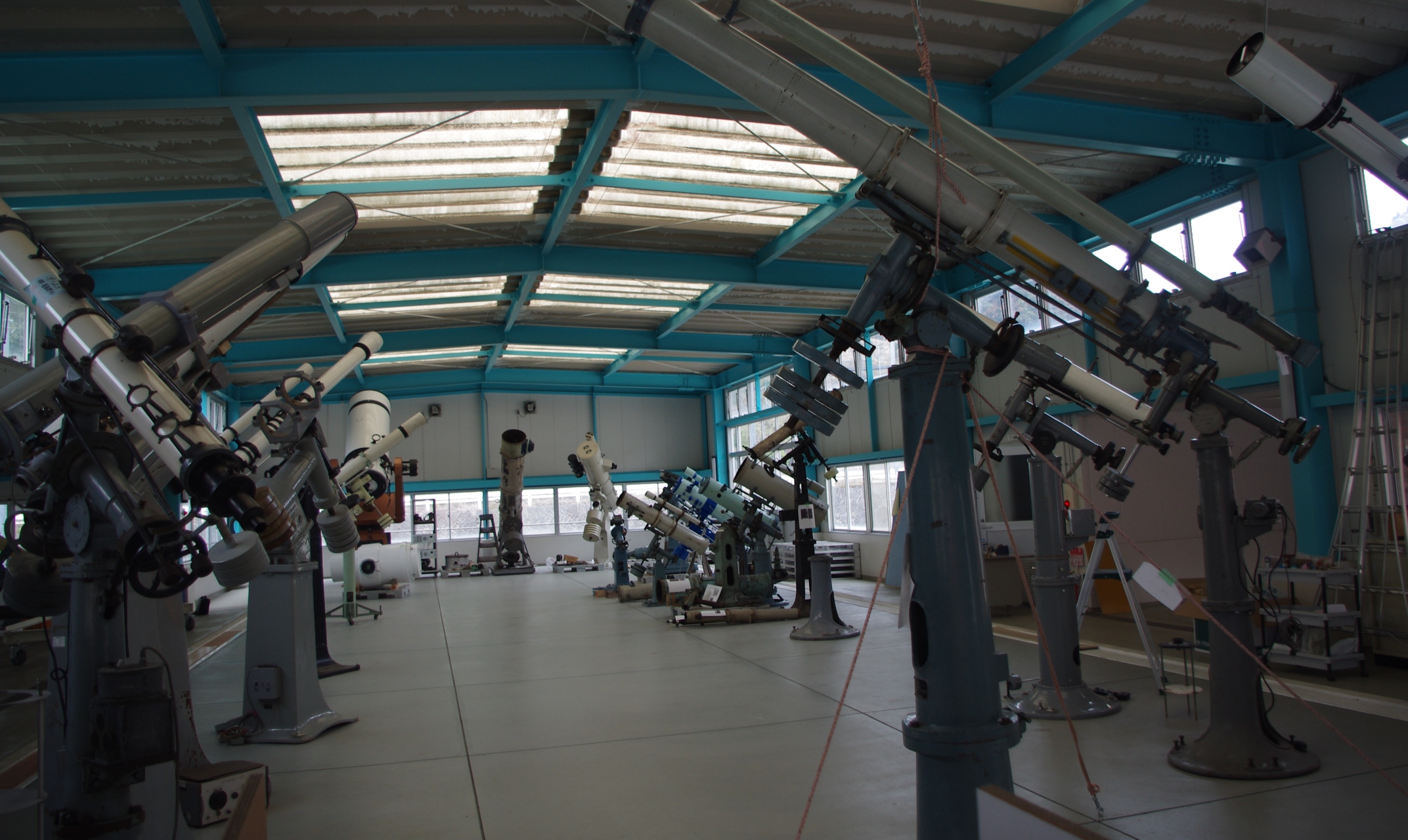 博物館の大型望遠鏡は、鉄骨造のプール跡地のように見えるので、基本的に建物は良く揺れると思います。これだけで高さの1/100変形しますから、高さが5メートルなら5cm建物が傾きます。ワイヤで吊るということは、地震のときに望遠鏡は5cm横に動くということになります。