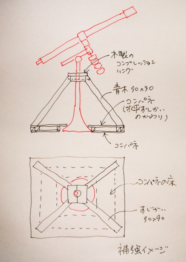 一番初めに私が提案したのは2m弱の井型に鋼で組んだやぐらに望遠鏡を固定し、やぐらはソリと床を滑らせ固定しない。という案ですが、10万円/台以下ではできませんで、却下されました。
