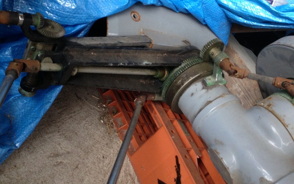 手元で操作する必用から、クラウンギヤ?ベベルギヤで90度に曲げて、平ギヤでこんどはユニバーサルジョイントでクランプに接続・・・なんて、本当に作動するんだろうか?(驚)