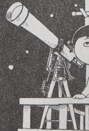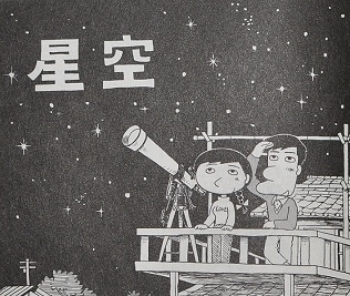 西岸良平氏作の「夕焼けの詩-千夜一夜劇場-」(三丁目の夕日)に、”星空”という、ほのぼのとした作品があります。そこに天体望遠鏡が出てきますが、五藤の6.5cm屈折赤道儀(旧型)に見えて仕方がありません。作品は、昭和50年頃作られた模様ですが、その赤道儀の形や、ファインダーの黒いフード、そしてフレキシブルハンドルがコイルと直棒になっている事など、見れば見るほどそう思えてきます。あの頃は宇宙時代と言われていましたから、作者も望遠鏡に興味があったのかもしれませんね。