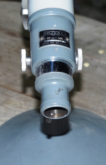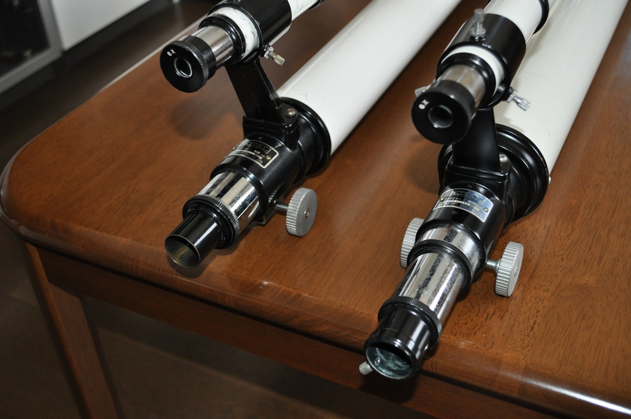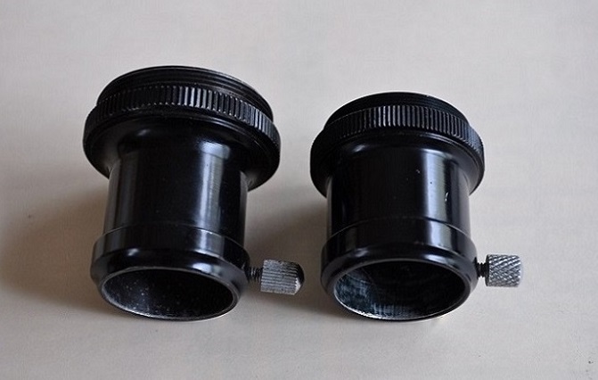 もう一つの画像は、アストロの接眼部です。締め付けネジのローレット加工の模様が、違うんですよ。左は取付部が一般的な36.4ネジのもので、シングルドロチューブに付いている物。右は、二段ドロチューブのもので、ミザールのH-100と同じ30.5ミリネジ(?)です。