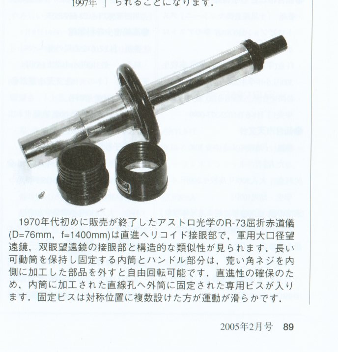 garakuma.gif  一昨年に、こちらの掲示板におこしの方が鏡筒を持ってこられており、興味シンシンで拝見いたしました。是非とも欲しいと思っているR73ですが、接眼部以外があって、接眼部がありません。