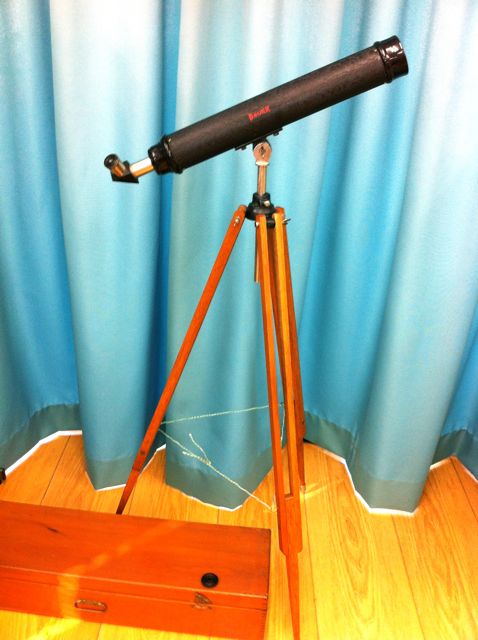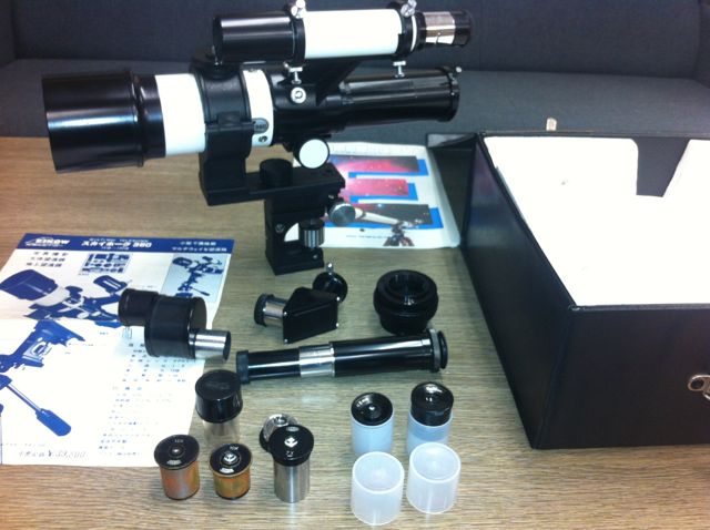 私の方はケンコーの10x40双眼鏡(7度 Bak4プリズムという意外とまじめな奴 2k)と、シュナイダーの4倍ルーペ(4k)くらいで望遠鏡の戦果無し。(ブックローンや学研ブランドの小口径は見かけるけど、金属三脚になってからの時代の物でプラ部品多く、魅力に欠けます。) |