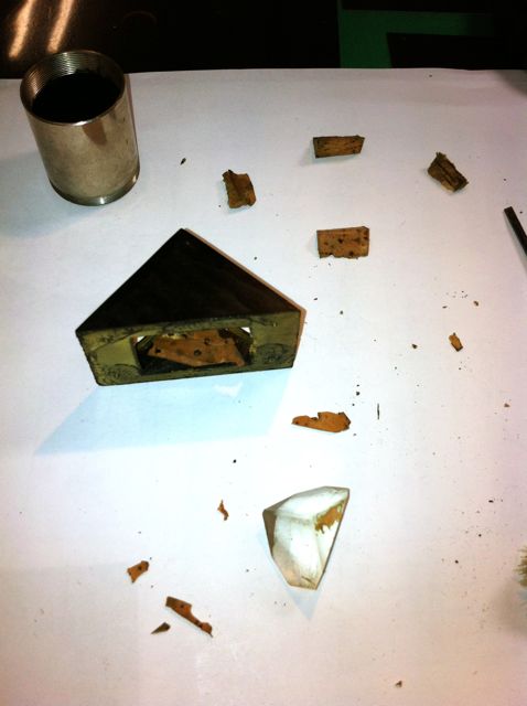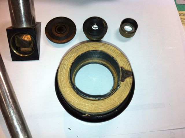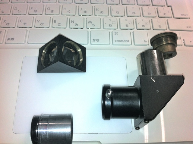 で、先だってのダウエルですが、 昨夜ようやくの快晴!まずは星像テスト開始 焦点内外像、動かすと、、なんと言うか、奇怪な模様がランダムに、時にはニ重星に変身、 焦点位置、、やや弓なりの、、完全に線じゃないか〜?! ファインダーがないので導入も大変ですが、導入後に固定するのがまた一苦労、 月はというと私の乱視みたいに二重ぼけでだるまの様に、、 対物レンズって乱視になるんだー? っってわけない! 色々試していたら、天頂正立プリズム(アミチプリズム?)の見え方がおかしいと気付き調整しては実視を繰り返し、、、 しかし、いよいよ断念、ジャンク箱より一般的な天頂プリズムを持ち出しリューターにて改造、取りあえず差し込める様にして完成!(でもオリジナル状態に戻せるようにしてます) ここまでで5時間!午前2時を回ってしまいました、、 当初の見え味がわからないで性能回復したのか向上したのかわかりませんが、、乱視は無くなりました! で、見え味は? 、、、あまり変わらなかったです!!