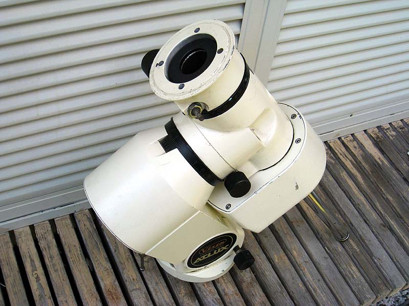 こんにちは。初めまして・・・ですよね?当方は2012年11月にお願いして2014年2月に受領した次第で、おっしゃる通り、同時期に作業されていた個体だと思います。但し、写真の通り当方の個体は内部の精度部品が軒並みお釈迦になっていた関係で動力伝達系をそっくり製作・交換してあります。赤道儀は前述の様な金額で購入したものだったので当然三脚は無く(組み合わせのメタル三脚は常連、呑様に買われて行きました)、ミード三脚を流用する関係で使えるような状態になったのは3月中旬。実は今日現在、実際に星を追わせていません。当方はMeadeの25cmSCと自作21cmニュートン反射を載せて楽しみたいと思っています。星祭等でお会いしたらその節はよろしくお願い致します。