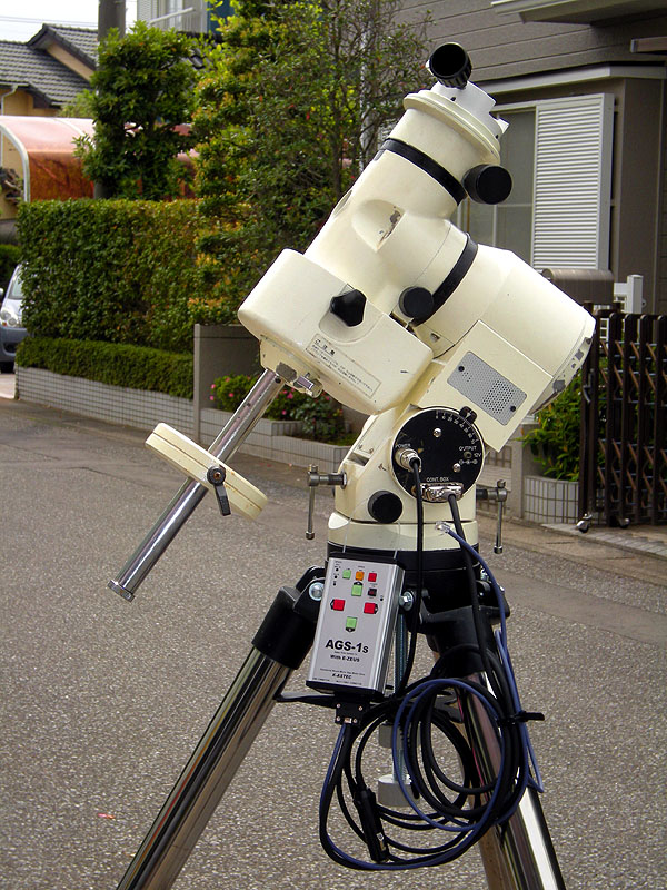kaba.gif 自分でスレッドを立ててレスする暴挙(笑)をお許しください。2年前に入手したジャンク赤道儀の再生が完了しました。部品取りされたのか、欠品多数で素人再生では見苦しくない程度の外見に仕上げるだけしか出来ず、結局、プロの手によるオーバーホールに頼っております。駆動系・電装系は全滅。部品欠品・破損の嵐!機械精度も各種精密部品(ウォームギア等)の破損で全く取れない状態でしたが、新たなパーツの作成等で、販売時の高精度を復活していただきました。大変な作業を実施して頂いたK-ASTECさんに感謝しております。自動導入は旧来の32倍速では実用にならず、最新のE-ZEUS化して高速ステッピングモーターを導入。三脚は純正品の入手が極めて困難な状態だったので、所有していたミードの20cmSC用のメタル三脚をもとにアダプターを作製して頂いております。この三脚の中古は丈夫な割に安価で取引されておりおすすめです。偶然ですが、赤道儀の台座とミード三脚の天板の直径が一致し、写真の通り、違和感なく仕上がりました。今後、ゆっくりと外観の塗装・再メッキ等、個人でできる部分を実施して綺麗にして行きたいと思っております。さ〜て、今夏は目一杯楽しむぞぉ!