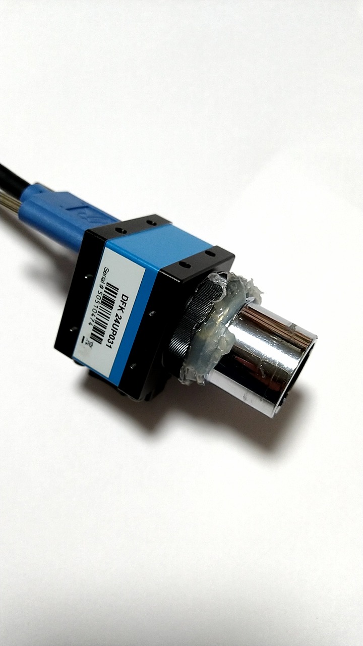 USBカメラを接続して撮影しようと思ったのですが残念ながら手持ちのCマウントアダプタがアメリカンサイズの接眼部用で 繋ぐことができず、今日は断念しました。 勤務先にCマウント−CSマウントの変換リング(厚さ5mm)があったはずなので借りてきて接眼レンズのスリーブと組み合わせて 取り付けられるようにしたうえで近々撮影しようと考えています。 |