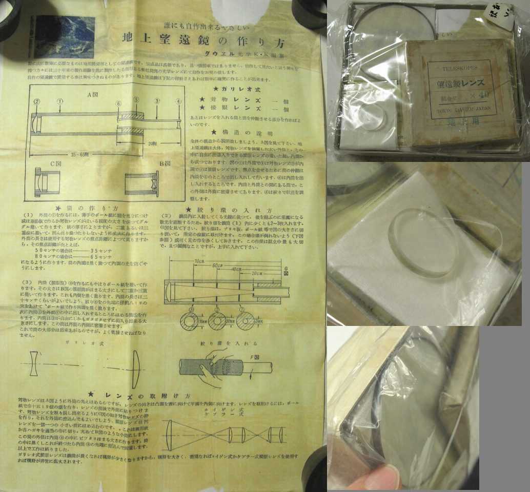 以前掲載したことがある代物ですが、誠報社さんのガラクタ市で、何故かスークーさんのブースで出土したダウエルの自作キットです。平凸窓ガラス製の対物レンズと、光学ガラス?白板?の平凹レンズの組合わせです。