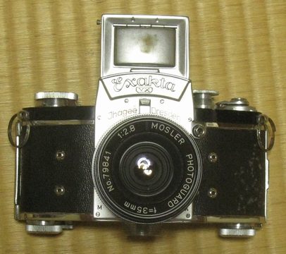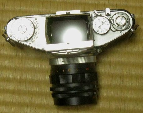 顕微鏡撮影装置が真上に積み上げ式なのでウエストレベルファインダーが正面に正対すると巻き上げレバーとシャッタースイッチが左側に行ってしまいます。右利きには操作しにくいため巻き上げはレバーを止めてノブ式にしています。科学撮影カメラの元祖?EXAKTAはシャッターも巻き上げも左側です。(「顕微鏡撮影用」説と、「開発者が左利きだった」説がありますが)確かに顕微鏡に載せると作業しやすいです。日常写真は大変ですが。。。