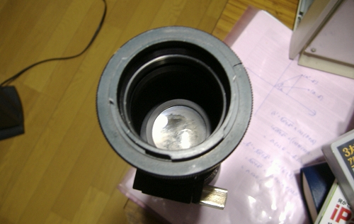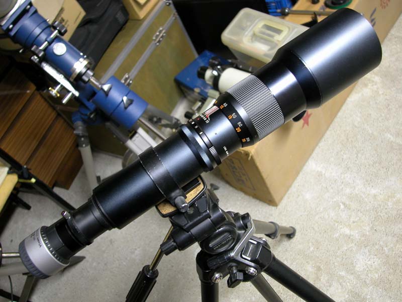 マルミで作っている訳が無いし。。。設計も凄くてビデオカメラのズームを一番望遠側に振って、それでやっと視野が蹴られない(実視界が非常に狭いアイピースが付いている)というシロモノ。目で直接覗くと12倍の映像が視野中心に狭くガリレオ式望遠鏡のような感じに見えるという。。。でも、カメラレンズに付く側を外すと普通のTマウントネジが出てきました。500mmf8の反射望遠に専用のレンズ群を配置しただけ。(まあ、この種の廉価なコンバーションレンズが、全部が専用設計の訳もありません)外した方が使い道が多そうです。。。