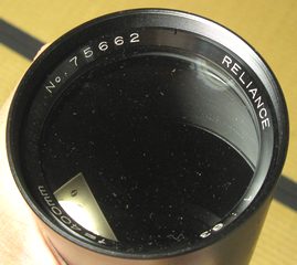 同じOEMと見られる3Bのリライアンス400mmf6.3です。私のレンズも後群の最表面が荒れて白っぽく、アイピースを付けて見ると眠たい像です。同一デザインで銘板のみ変えたレンズは数種類はあるようで中古カメラ屋の片隅で良く見かけます。(オリオン?ライオン?他にもあったな・・・)先日、大阪駅前第三ビル地下2Fのカメラ屋のジャンクBOX(足元で見つけ難い)にもリライアンスが1本転がっておりました。