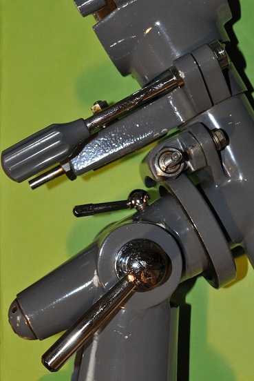 さて、エイコーといえば、9cm反経やロッド式鏡筒、或いは一眼レフファインダー等を思い浮かべます。しかし60年代後半製と思われる赤道儀も実に優美な形状で、独特の雰囲気を持っています。画像は6cm屈折用の赤道儀で、赤経軸の南端の曲面、同軸クランプの丸いヘッド、そして赤緯微動や鏡筒バンドのユニークなメカニズムは、見とれてしまうほどエレガントです。また、つやのあるグレーの塗装も、お上品ですね。