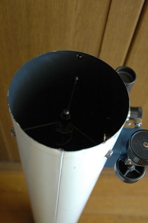 後期型の鏡筒リングをはずした鏡筒の写真も添付します。呑さんが記しておられましたが、煙突屋さんが鏡筒を鉄板から丸めていたとは、ちょっとした驚きです。また、リングや斜鏡スパイダーを取りつれるために鏡筒に開けられている穴は楕円形です。組み立ての際に、位置を合わせるのにご苦労されていたんだなあと、しみじみ思いました。