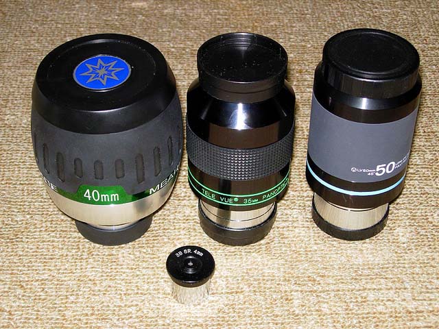 kaba.gif 皆さん、お気に入りのアイピースは何ですか?望遠鏡にもよると思いますが、最近、比較的大き目のシュミットカセグレンにロングアイの低倍率用アイピースを付け、ぼや〜っと観望するのがマイブームです。時々、球状星団や散開星団を見つけるとずーっと見ていたりして・・。でも、2inchのアイピースって何であんなに巨大なのでしょうね?完全に望遠鏡のバランスが崩れています。1枚目の写真は80mmアポにMeadeの視野68°40mmアイピースを付けた所。ナグラー31mmよりも巨大で望遠鏡もどっちが前だか判らなくなっています(笑)。でも、これ良いですよ!凄く覗き易く、バックグラウンドも真っ暗で迷光が少ないのが判ります。2枚目の写真は当方の所有する巨大アイピーストップ3群!一番左は前出のMeade製。まるで樽ですね(大笑)。隣はご存知、パンオプティック35mm。視野の周辺まで点像の星で一杯。ゴーストが少ないのは周知の通り!金額に納得します。最後はLV50mm。大きさの割りに軽く、やわな反射望遠鏡の接眼部にぴったり。像は少し甘いぞっ・・・と・・・。手前はスーパーレア(大笑)の24.5mmサイズ、3B製SR-4mm。重量比で言ったら100倍近くありそう。視野を広げる必要があるので太くなるのは判りますが、ちょっと極端すぎな感じですね。そこで31.7mmサイズでロングアイで覗き易く、そこそこの視野角を有するアイピースをお教え下さい。よろしくお願いします!