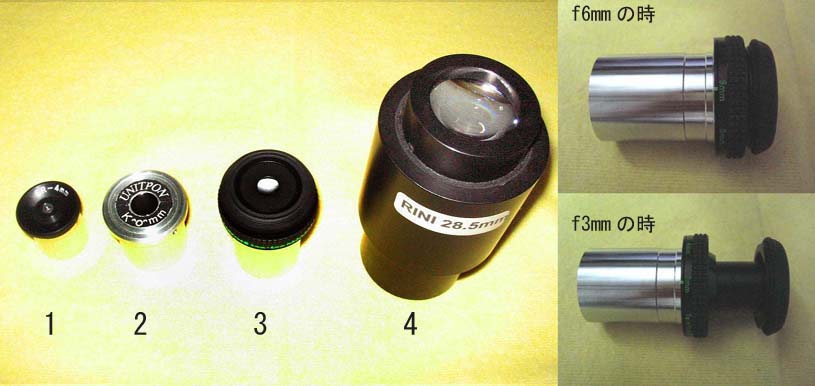 2は工場顕微鏡用(φ30mm)のにアダプタを自作して使っているメーカ不明のK20mm(と思う)。