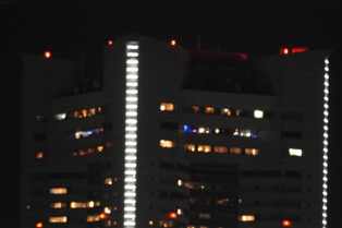 上の写真の、右側の真ん中辺りに(見にくいですが)非常口の灯りが見えます。9センチアポで300倍以上で見るとヒト形の絵も確認出来るんですが、光軸ズレズレの現状では無理でしたね。 |