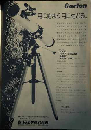 ガラクマさん、皆さん、こんばんは。 このごろ、とてもきれいな月夜が続いています。サラリーマン眼視観望派としては、仕事に影響しないよう、就寝前の短時間に月面を観望するのがやっとの状態です。でも、月は何度見ても見飽きませんね。 さて、今回は、カートン100E型10センチ反射望遠鏡を紹介させていただきます。リサイクルショップから救出して、おおよそのレストアをしてみました。 この望遠鏡は、天文ガイドの広告に「月に始まりつきにもどる」とするキャッチフレーズとともに出ていたのが印象的でした。 実際に覗いてみると、F10の長焦点のためか、切れ味のいいシャープな見え味です。ファインダーに天頂プリズムを内蔵しているのが特徴ですが、これは、使い勝手が良くないです。 接眼部は、二段引き出し型となっていて、とても凝っています。 三脚や、赤道儀のデザインはカートンらしくスマートでいいですね。 広告は天文ガイド1976年8月号に掲載されたものです。