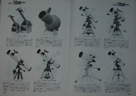 呑さん、詳しいレスありがとうございます。設計者に携われた方のお話を伺えて、恐縮です。 確かに、ニュートン式では、ファインダーを覗く際、ホッペが冷たいことがありますね。(夏は気持ちよかったりしますが…)。 このL型ファイダーのこだわりは、さすがといいますか、モデル末期まで貫かれています。 添付の写真は、天体望遠鏡のすべて1993年版ですが、カートン製の10センチ反射は、100Eをはじめとして4種類が掲載されています。 いずれも、L型ファインダーです。 次号の1995年版には、100Eは掲載されていませんので、このあたりが最終モデルということでしょうか。 でも、この100Eは長寿モデルでしたね。途中、ファインダーの調整が3点式からXY式に改良されていることがわかります。 斜鏡の調整法は、どうだったのでしょうか、わかりません。 それから、赤道儀ですが、参考までにカートン6センチ屈折用の新旧の写真を添付します。黒が旧型で、青が新型です。 新型は極軸調整ボルトが追加されていますので、ボルトを緩めたときの「おじぎ」の心配がなくなりました。そのほか、赤緯、赤経目盛の指標も違ってます。 こうした、細かいところに改良が加えられていることから、カートンが良心的なメーカーであることが分かります。 そうしたなか、100Eの赤道儀は、はじめからターンバックルがあったので、「おじぎ」の心配はありませんでしたし、特別仕様という感じて、ちょっと高級に見えますね。