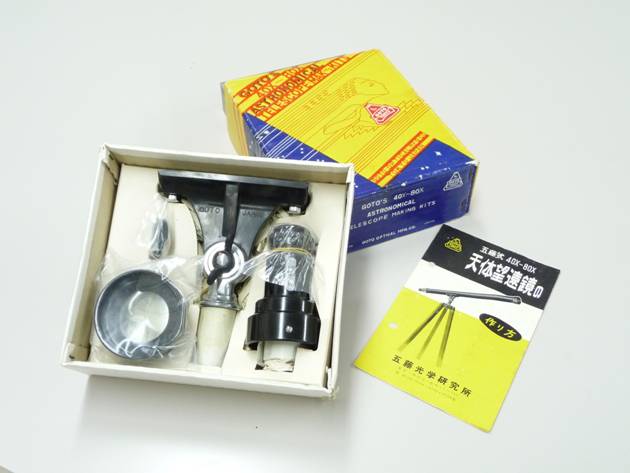 そこで、押入れの隅からこんな物を引っぱり出してきました。「五藤式40×〜80×天体望遠鏡『組立キット』」の未開封品です。確か昭和30年代の初め頃に発売されたと思いますが、当時のカタログの写真と同じポーズで撮影してみました。中学生の頃、造り酒屋の息子の同級生が持っていて羨望の眼差しで眺めていたものが、50数年後にようやく入手できました。開封して組立ててみたい衝動に駆られますが、そのまま保存しています。