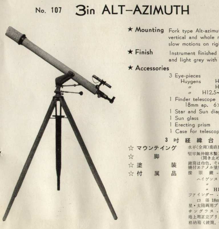 最近ジャンクボックスから屈折用のフォーク架台を発掘しました。それは数年前に友人から捨てようと思うのだけど何か使えそうなら?と頂いたものでした。フォーク部分の作りは堅固でしかも何か分からないけど気になる事がずっとありました。特徴ですが色は黒で耳軸のスパンは115mm(8cm用?)フォークはアルミ製ですが架台の下部は鉄製で重量感があります。しかし表面を良く見ると塗装が擦り切れている部分から下地のグレー色が見えています。プライマーにしては艶があるので疑問をいだき表面の塗装をアセトンで溶かしたらオリジナルはグレーであることが判明しました。もしかしてとレトロ望遠鏡資料館の五藤の米国向けカタログを参照すると3吋経緯台(11/14)と良く似ている事が分かりました。ただ詳細な画像が無いので決め手がありません。少しでも情報をお持ちの方がいらっしゃいましたら意見をお伺いしたいです。