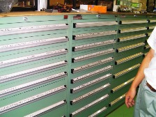 部品の保有量も日本一ではないかと言われていらっしゃったように、ハンパではありません。写真に工具入れの棚がならんでますが、あの中にはびっくりする量のパーツがあります。反射望遠鏡の接眼部なら、ドロチューブ径=60mm、85mm、95mm、105mmのタイプが接眼部として組み上がった形で、それぞれ数十個づつ保管されております。