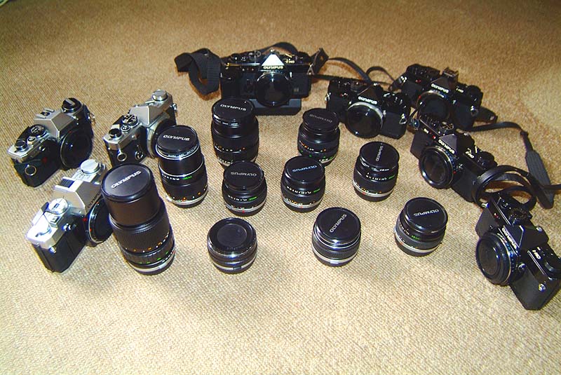 kaba.gif 確かに一つの時代が終わったと感じますね。M-1が発売された頃は確かキャノンFT-Bを使用していましたが、交換レンズを持ち歩くのに苦にならない小型軽量性、手振れ防止なんぞ必要ないソフトなシャッター、明るく大きなファインダーの3つに惚れこみメイン機種を変更しました。写真は当時購入したOM-1初期型から最後に購入したOM-30まで。故人から譲って頂いたM-1ブラックを除くとレンズもボディも全てワンオーナー、新品購入品です(もう全て中古ではなく大古状態ですが・・・)。その中で一番新しいOM-30が一番先に作動不良を起こした・・・ってのが電気カメラの悲哀を感じます。