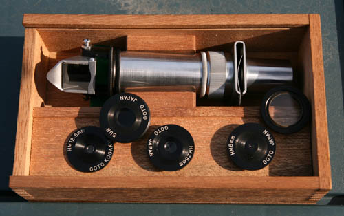 プリズムの付いた変わったアイピース?は太陽投影プロジェクタだったっけ?太陽像を壁に投影して見せたり、その光量を用いて差込口からスライドを差し込んで像を投影したり・・・という物だそうです。(私も使ったことが無いので良く分からないのですが・・・)