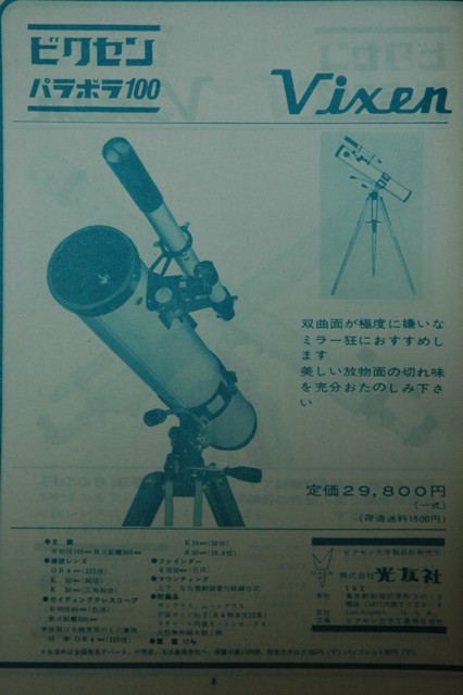 さて、ビクセンのパラボラ100ですが、古い天文ガイドを見たら、1968年8月号に広告がありましたので、画像を添付します。