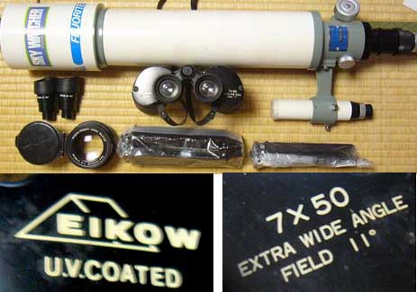 スターベースさんで何故かテレトのご主人と遭遇。(笑)雑品を2〜3購入。その他望遠鏡販売店を回るけど目立った収穫無く、リサイクルショップで顕微鏡アイピース(WFX20 バローレンズ付の変な奴)等を入手した所・・・笑いの神様が私の肩に降り立ちました。エイコー双眼鏡7x50・・・でも視界11度・・・見かけ視界77度・・・カビカビでしたが躊躇せずゲット(かなり手間がかかりそう・・・先日もカビカビのカートン製7x35 12度!!を入手清掃中なのに・・・)