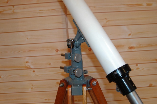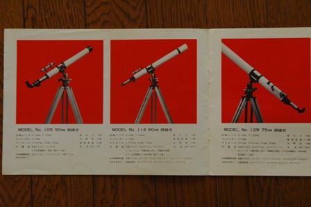 この望遠鏡のオリジナル像は、このホームページの「レトロ望遠鏡資料館」一階にある五藤光学欄の「米国向けカタログ」で、初めて分かりました。6cmの経緯台のうち、F20は上下微動棒、F15はこのタイプだったわけですね。