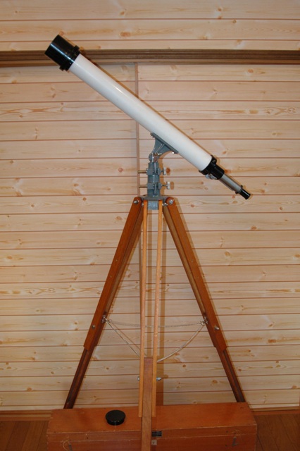 五藤光学製の6センチ屈折経緯台の画像を添付いたしますのでご覧ください。この望遠鏡は昨年入手したのですが、もともと中学校の備品だったとのことでした。入手後、五藤光学のテクノサービスに鏡筒のオーバーホールを依頼して、なかなかいい感じになりました。ただ、三脚は残念ながらオリジナルではありません。また、ファインダーも欠落しています。五藤光学によると、昭和30年ころの製品で、「二吋半屈折経緯儀」と呼ばれていたとのことでした。木製格納箱に記された五藤光学の住所が「東京世田谷」となっていることから、少なくとも昭和38年以前であることがわかります。経緯儀は上下水平微動ともスプリング式の部分微動です。経緯儀の使い勝手は、まあまあですが、上下の粗動クランプには気を使わないと、鏡筒がカックンとなってしまいます。アイピースにハイゲンを使っての見え味も透明感があってグッドです。でも、一番いいのはインテリア度とでも言いますか、古スコとしての雰囲気が気に入っています。