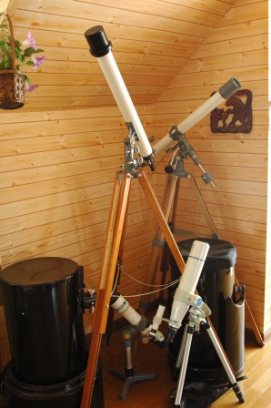 写真は、接眼部から見た経緯台とユニトロンのカタログ、インテリアとして鎮座している様子です。