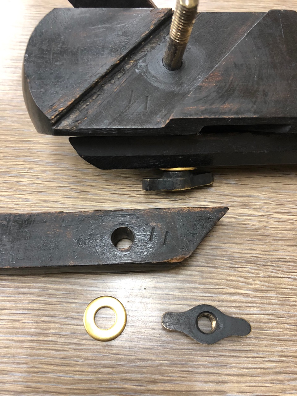 この写真は、後の日本の望遠鏡部品のように、脚とスロットのメーカーマークを示しています。 または、各脚が正しいスロットに適切に収まるようにします。