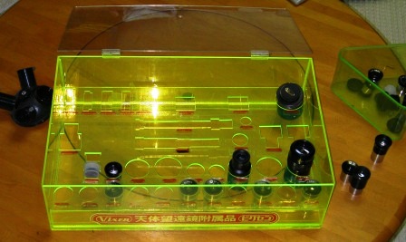 garakuma.gif  面白いコレクターグッズを手に入れました。ビクセンの販売用ショーケースです。1980年代のものでしょうか(調べれば分りますが、まだ十分調べておりません)。E-20mmはありませんが、31.7mm用の穴もありません。